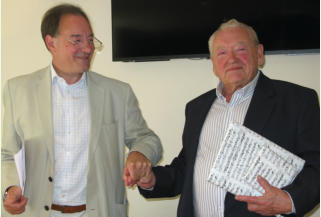 The AGM at the Sacred Hearts Church Hall, Charlton Kings, Cheltenham on 5 May 2018 marked the end of Gerald Towell’s fifteen-year tenure as Chairman of the Arthur Bliss Society. In the early 2000s he had been invited by Lady Bliss and the Bliss Trust to set up a society to promote the knowledge and understanding of the music of Sir Arthur Bliss. He found enthusiastic volunteers for his committee from members of Charlton Kings Choral Society, who had recently performed Morning Heroes, and three of these original committee members, Sue Crownshaw, Jill Smith and John Wright are still serving. Later recruits from the same source were David and Helen Wilby. It was proposed that David Wilby should succeed Gerald as Chairman and that Andrew Ellis should take over from Helen Wilby after her eight-and a-half year service as Treasurer, both appointments being approved unanimously. Fortunately, we are not losing Gerald as a member of the Committee, as he wishes to continue managing events and promoting performances of Bliss works locally. Helen will continue as Webmaster. After the business of the AGM was finished, our President Ian Venables presented Gerald with gifts from the Society, paying tribute to Gerald’s inspirational chairmanship. On behalf of the Committee, David thanked Christine, Gerald’s wife, for her hospitality and support, and presented her with a small token of their appreciation.