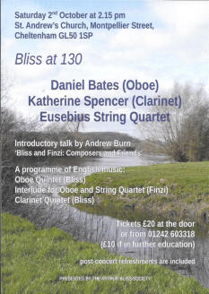 The AGM Concert, a celebration of the 130th Anniversary of the birth of Arthur Bliss, was held at St.Andrew’s Church, Cheltenham on Saturday, October 2nd. Presented by the Arthur Bliss Society, the event was generously supported by the Bliss Trust and the Gerald Finzi Trust. An introductory talk, ‘Arthur Bliss and Gerald Finzi: Composers and Friends’ was given by Andrew Burn, who has written and broadcast extensively on British music of the 20th and 21st centuries. Andrew is Chairman of the Bliss Trust and honorary Secretary of the Finzi Trust.